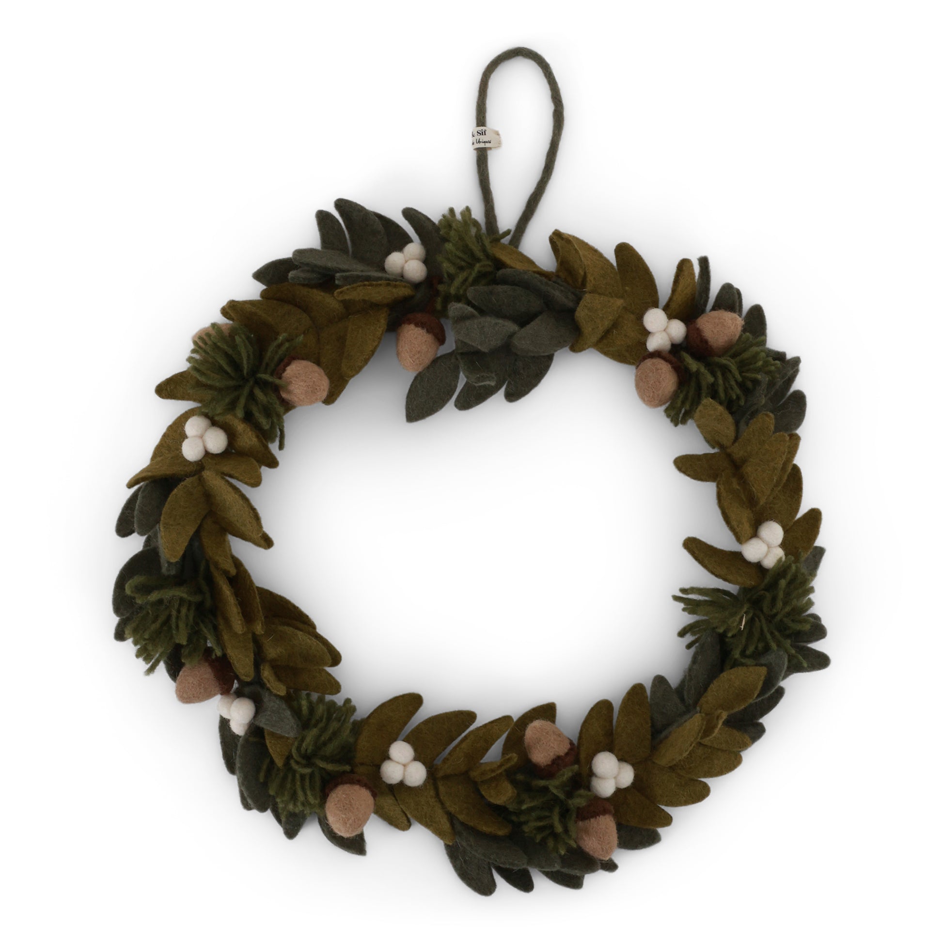 Ein liebevoll handgefertigter Winterkranz, geschmückt mit weißen Beeren und kleinen Filzeicheln – als hätte ihn der erste Schnee sanft berührt. Eine schlichte, aber zauberhafte Dekoration, die jedem Raum im Winter eine warme und natürliche Note verleiht.
