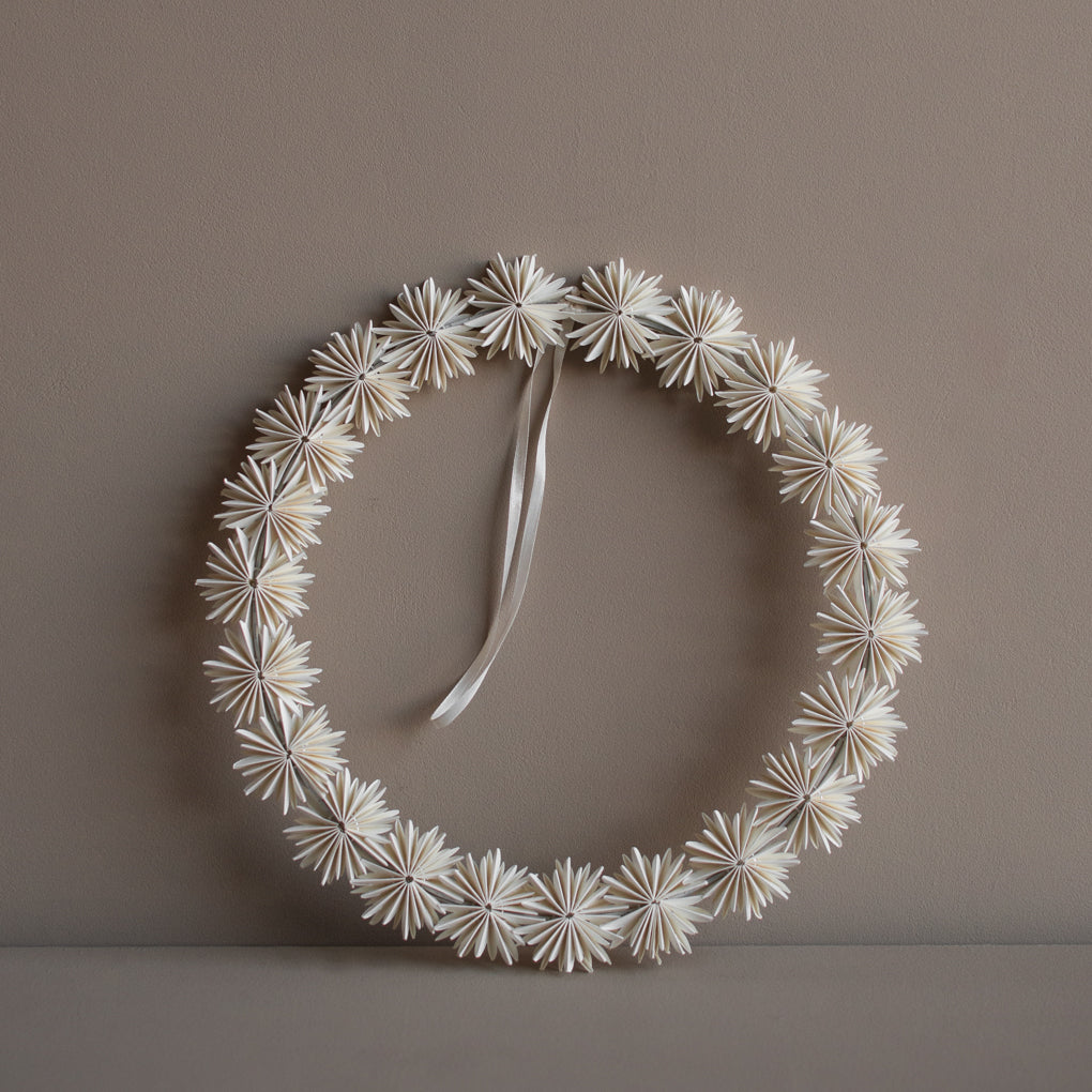 Manchmal darf es ganz unkompliziert sein – dieser Papierkranz bringt eine leichte, moderne Winterstimmung in dein Zuhause, ganz ohne Geduld beim Binden. Die zarten Schneeflocken formen einen schlichten, eleganten Kranz, der sich perfekt an Tür, Wand oder Fenster macht. Ein dekorativer Blickfang, der sofort für ruhige, winterliche Atmosphäre sorgt.
