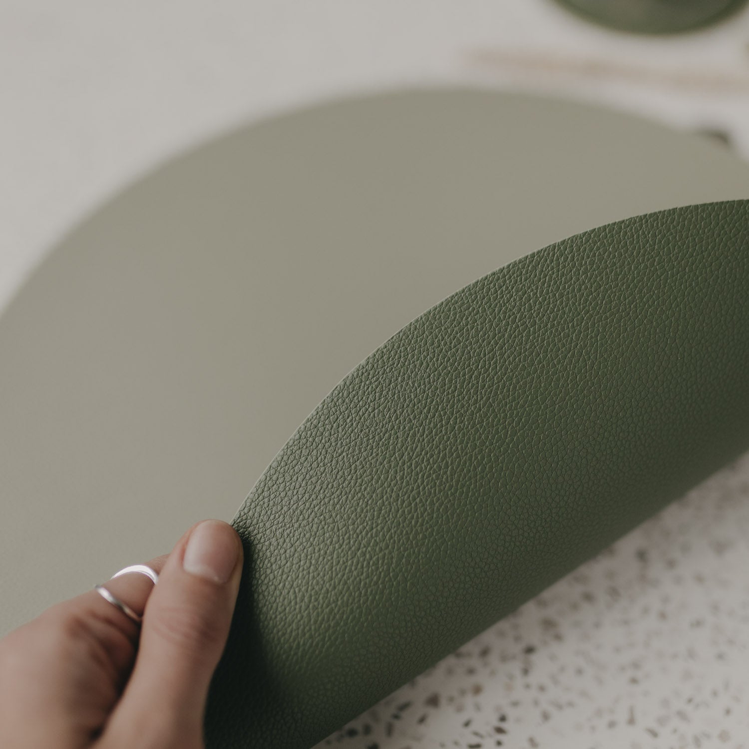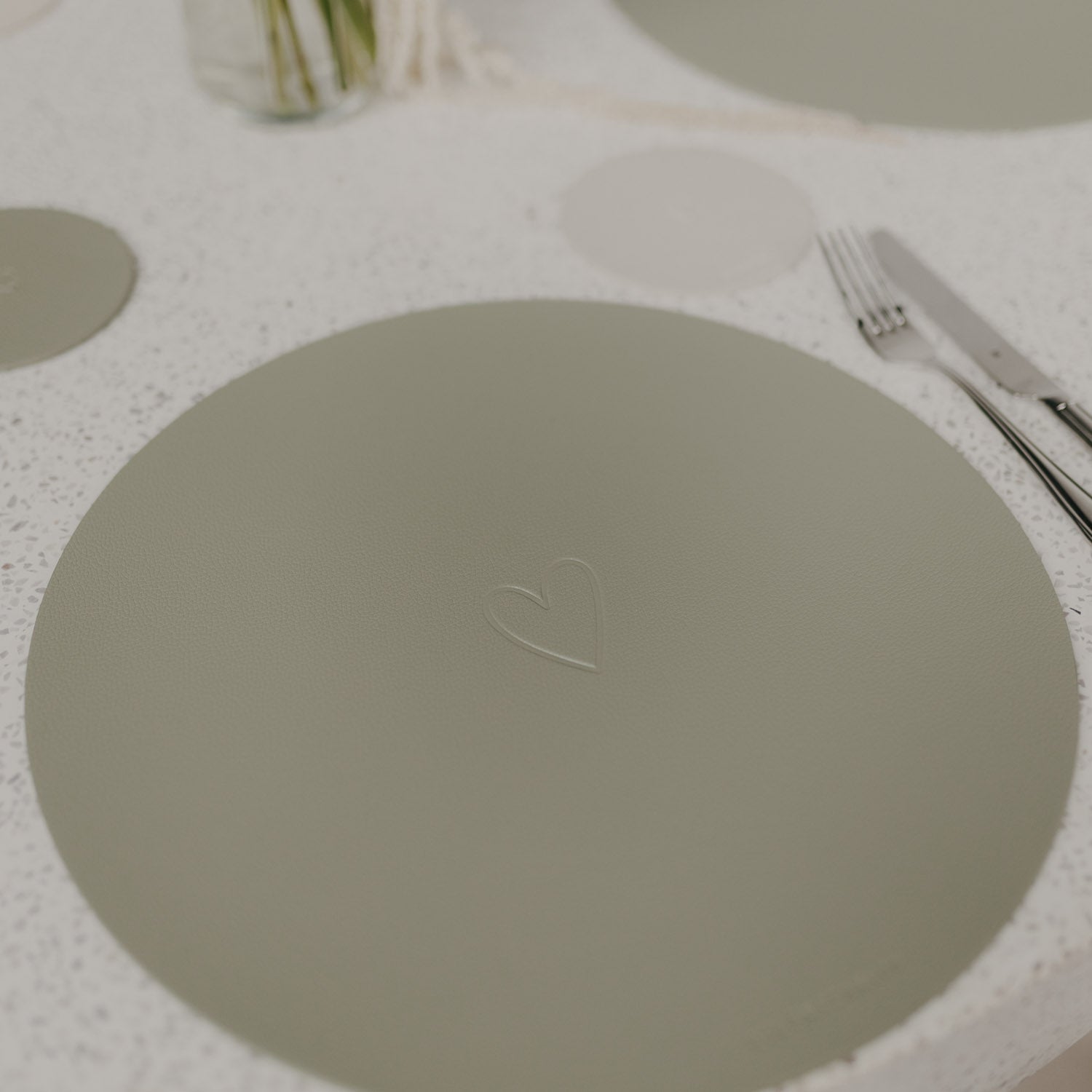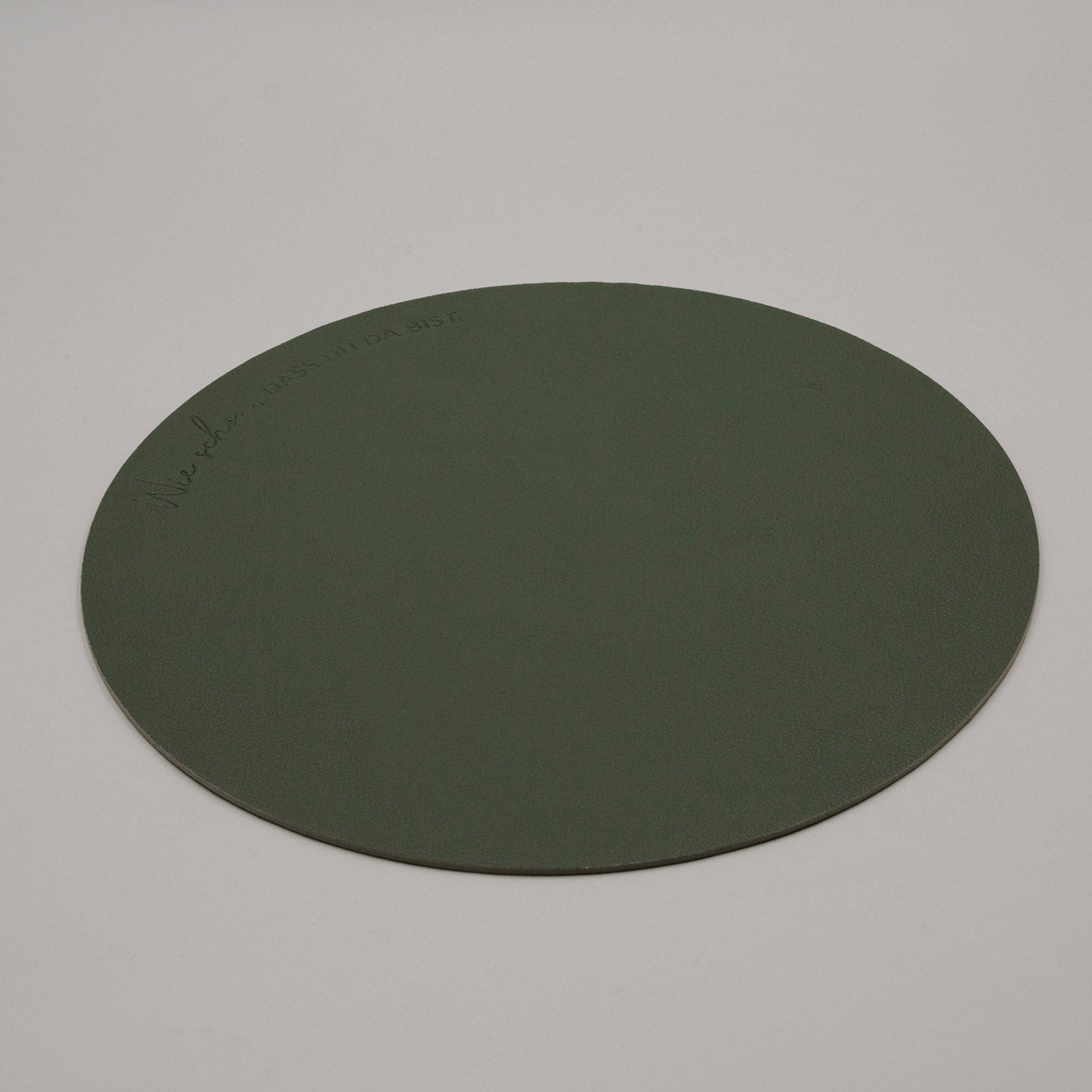Das wendbare Platzset „Wie schön“ in grün von Eulenschnitt bringt eine warme, ruhige Stimmung auf deinen Tisch. Eine Seite trägt den Spruch „Wie schön, dass du da bist“, die andere ein zart geprägtes Herz. Schlicht im Design und wunderbar vielseitig – für Alltag und besondere Momente.